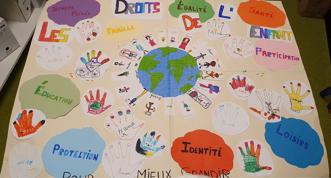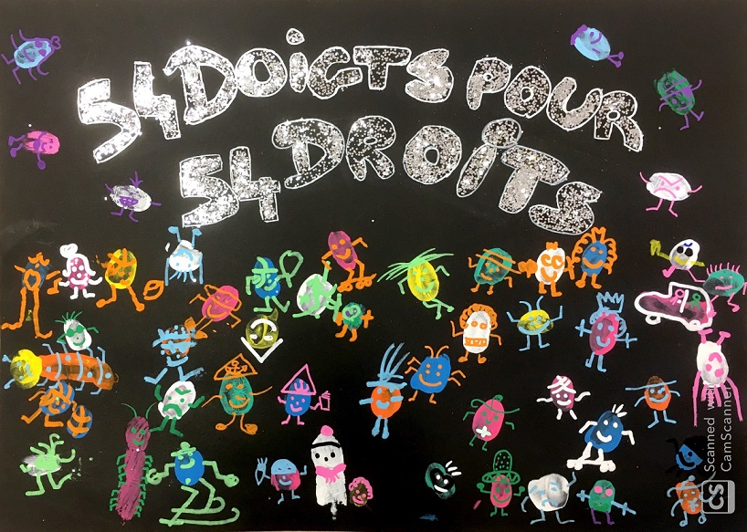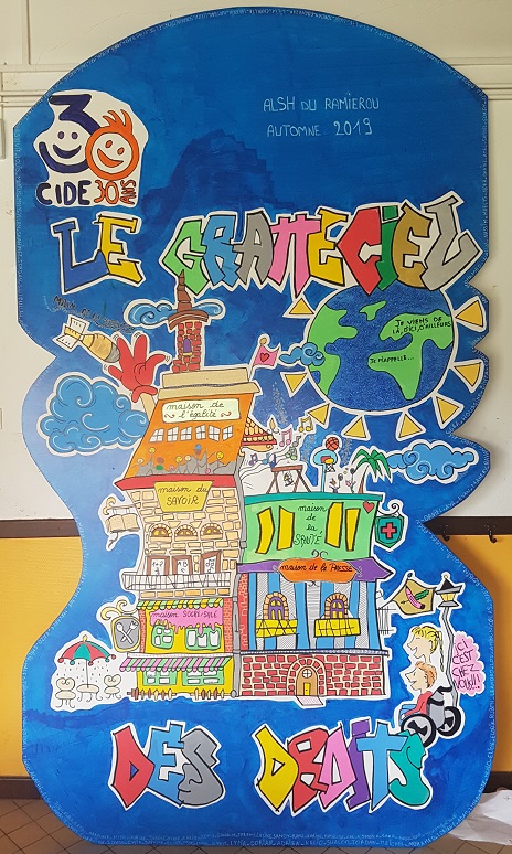 La fresque représente le gratte-ciel des droits. Les 10 principaux droits sont représentés au sein d'une même "maison". Les enfants ont choisi les noms de chaque maison en fonction du droit qu'…