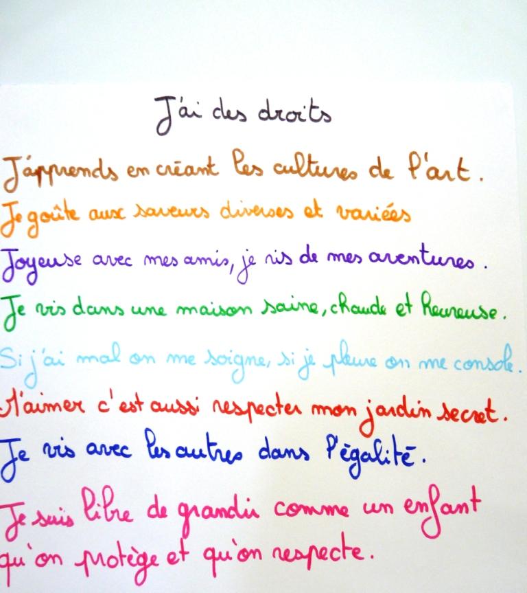 Nous avons fait un poème sur les différents droits que nous souhaitions mettre en avant et avons ensuite réalisé l'affiche.